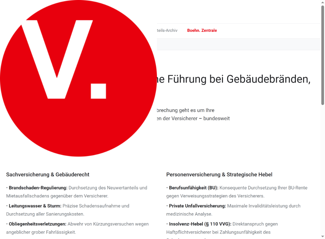 Bei Großschäden durch Brand, Leitungswasser oder Betriebsunterbrechung geht es um Ihre Existenz. Wir steuern die Regulierung strategisch gegen die Taktiken der Versicherer – bundesweit und konsequent. 40 Jahre Prozesserfahrung für Ihr Recht.